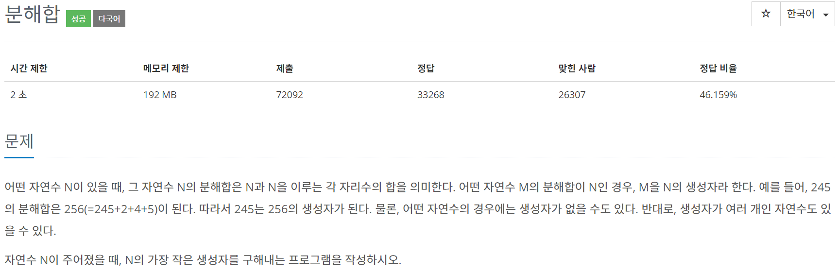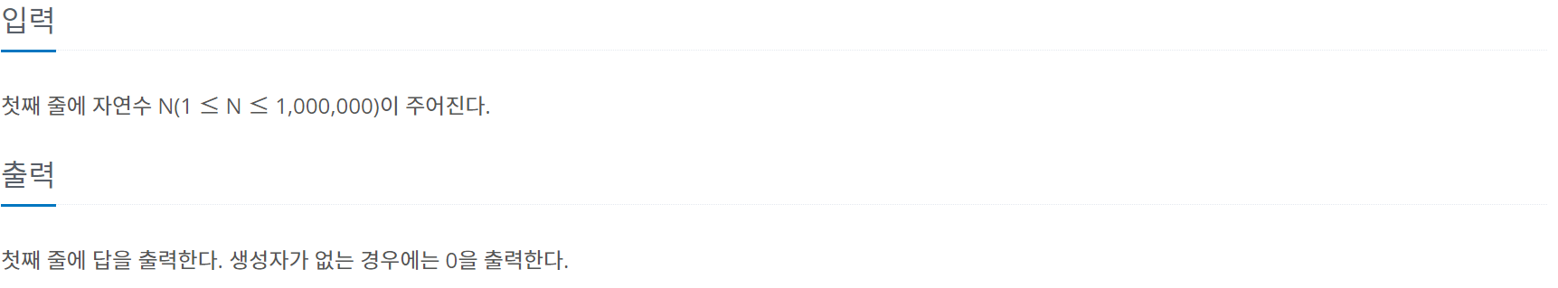 문제에서 정의된 N의 생성자 M들 중에서 가장 작은 생성자를 구해내는 프로그램을 작성하라고 제시하였습니다.