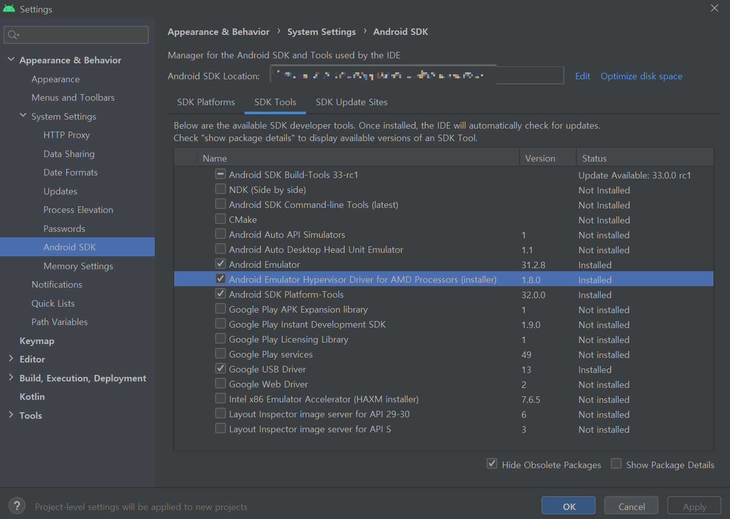 Android Emulator Hypervisor Driver for AMD Processors (installer) 체크 및 적용