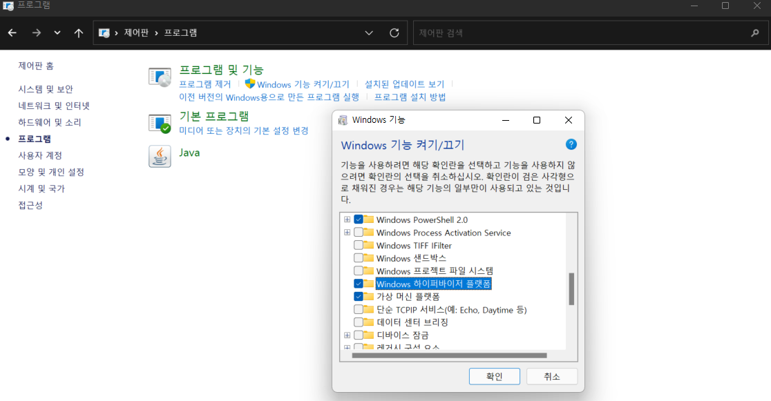 2. 제어판 - 프로그램 - 프로그램 및 기능 - Windows 기능 켜기/끄기