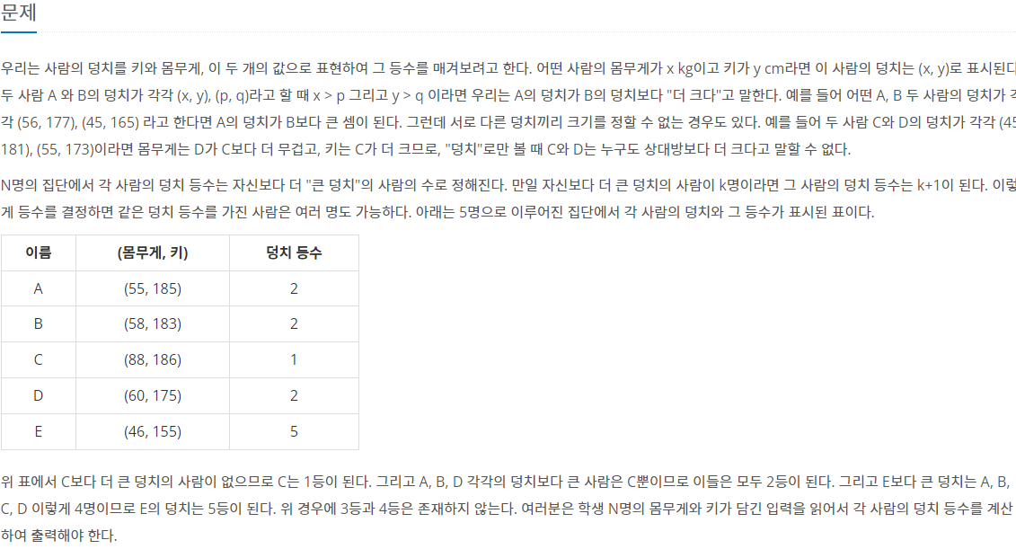 덩치가 큰 사람이 순위가 높은 것인데 문제에서 정의하는 "덩치가 큰 사람"은 몸무게가 더 많고 키가 더 큰 사람을 말합니다.