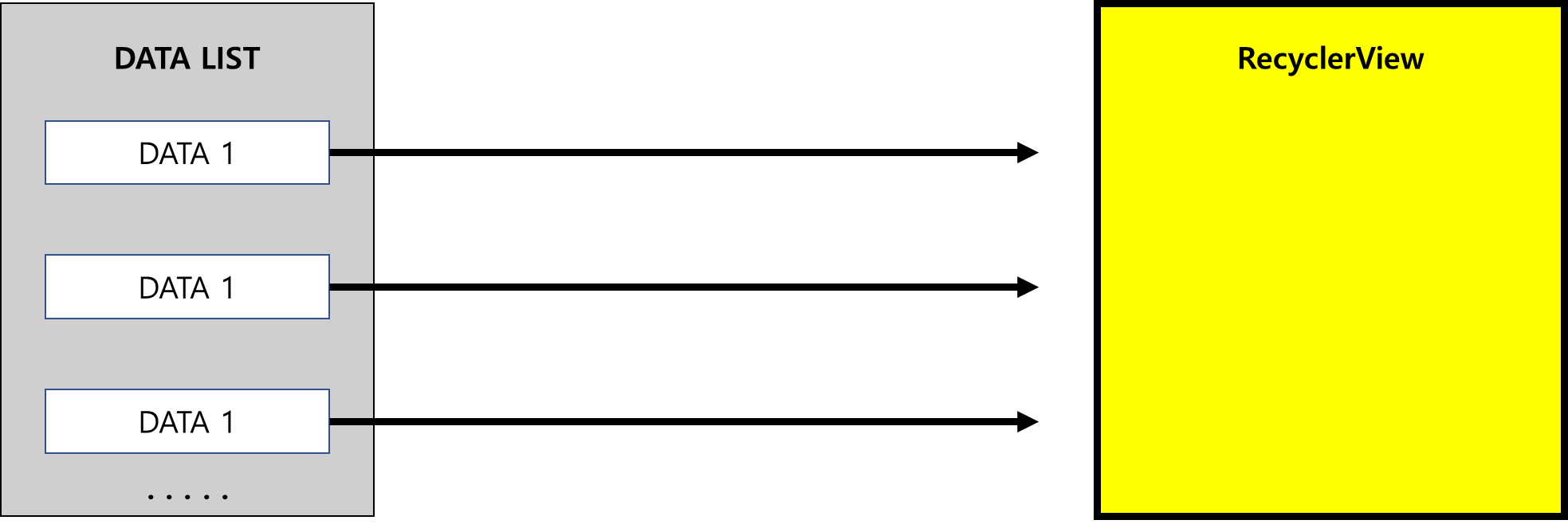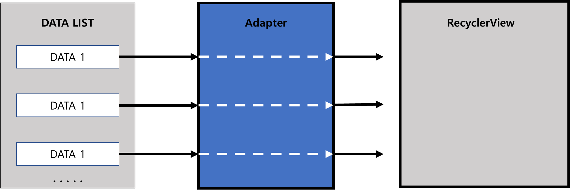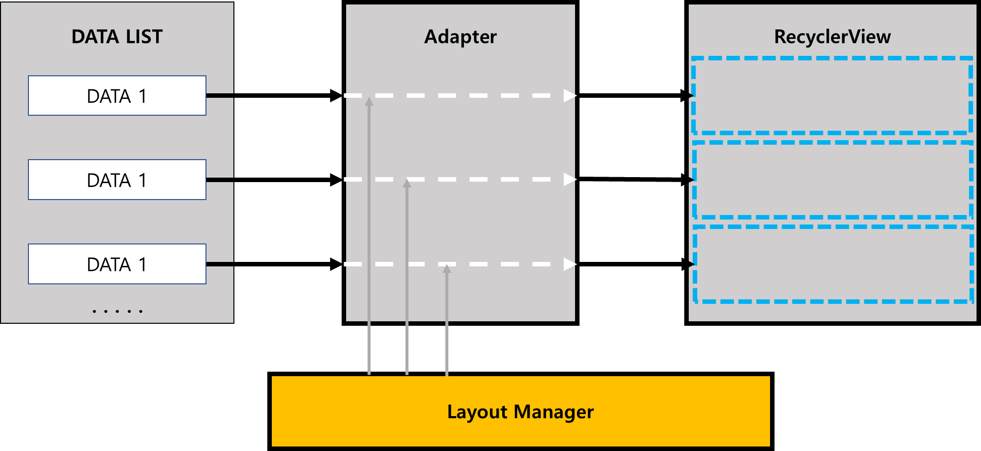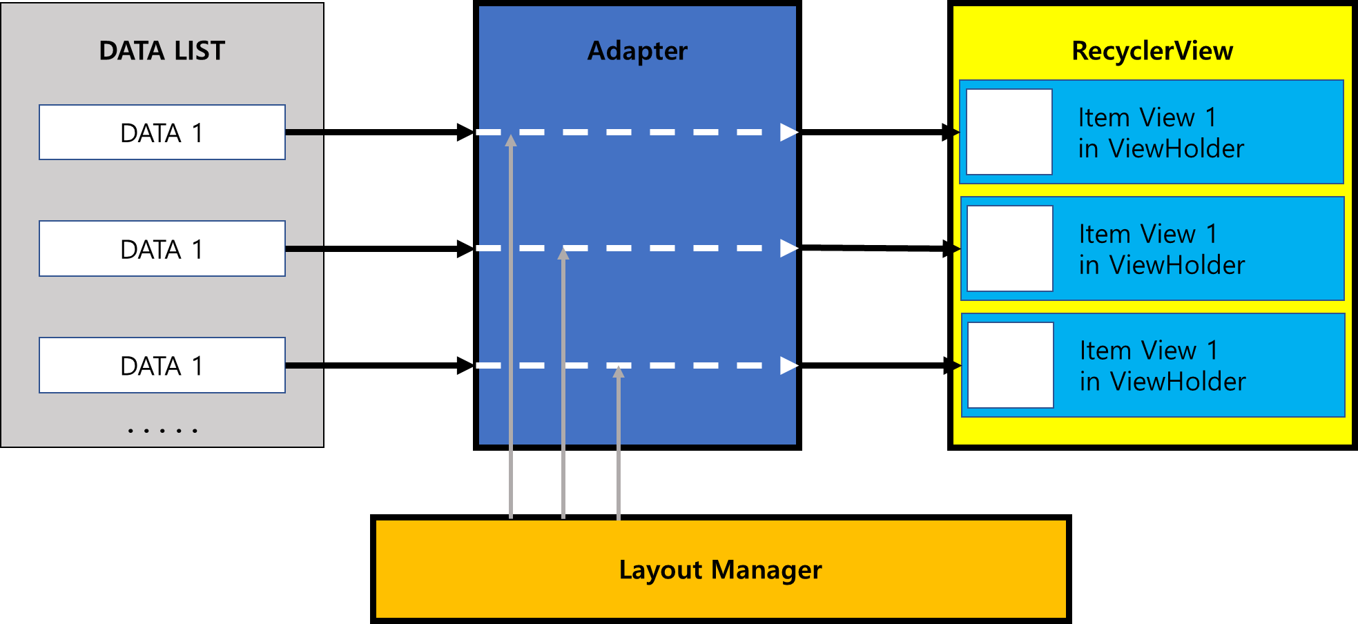 RecyclerView는 데이터 목록을 아이템 단위의 View로 생성해서 화면에 표시하기 위해 Adapter를 사용합니다. Adapter에 의해 생성된 View 객체를 어떤 방식으로 나열할지 결정하기 위해서 Layout Manager를 이용합니다. 끝으로 Layout Manager가 제공하는 형태로 Adapter가 생성한 View를 ViewHolder 객체에 저장되어 화면에 표시하게 됩니다.