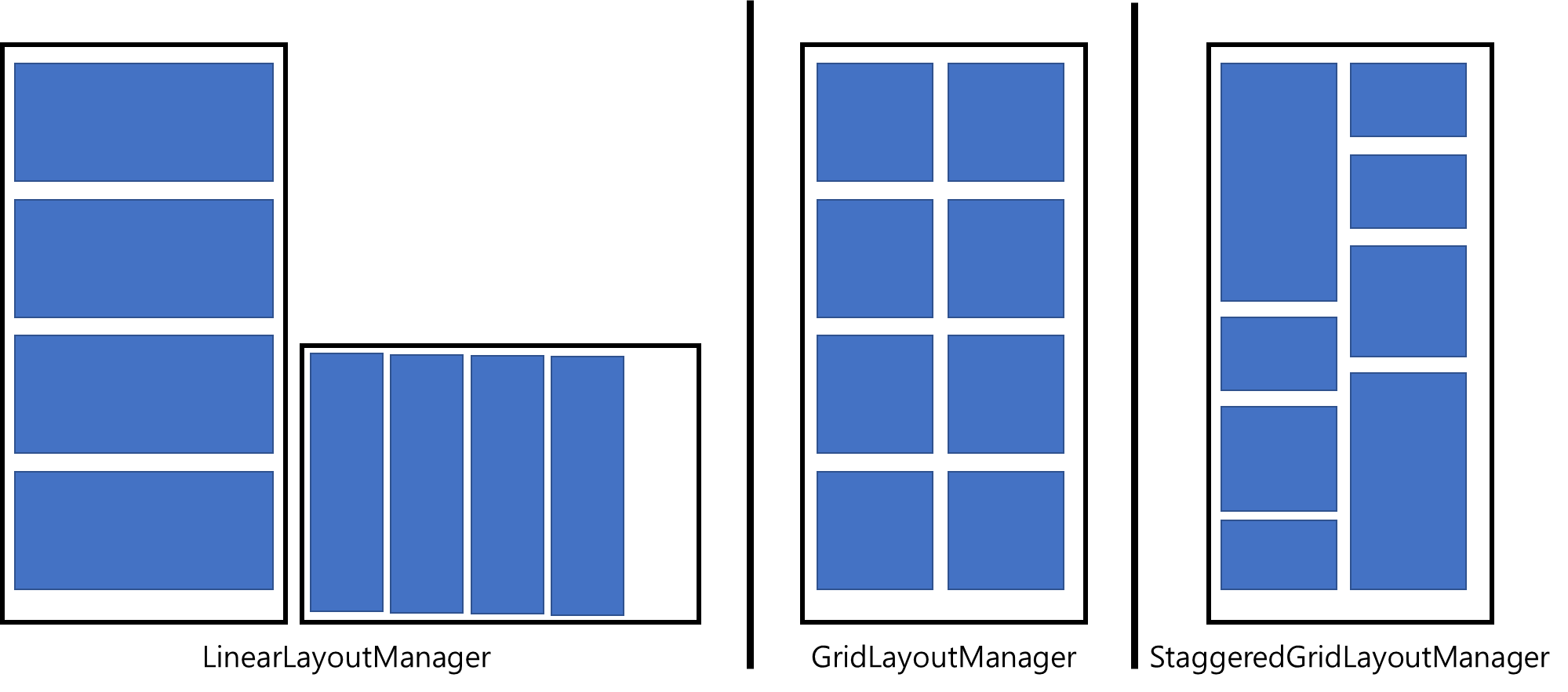그러나 RecyclerView는 이러한 단점들을 보완했습니다. 수직뿐만 아니라 수평 및 2차원 격자(Grid) 형태로도 아이템들을 나열할 수 있고, 아이템 뷰의 동적(Dynamic) 구성을 용이하게 해 주며, 이를 런타임에 바꿀 수도 있습니다. 이런 특징들이 RecyclerView의 유연함을 나타내는 장점들입니다.