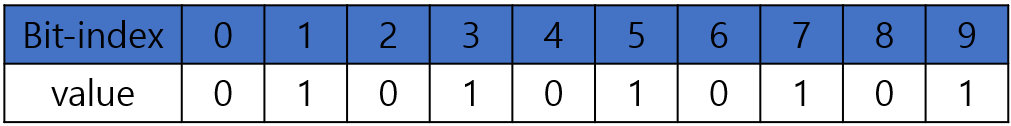 예를 들어서 10bit로 집합 A = {1, 3, 5, 7, 9}를 표현하면 아래와 같습니다.