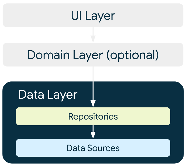 데이터 레이어는 0개부터 여러 개의 데이터 소스를 각각 포함할 수 있는 저장소로 구성된다. 앱에서 처리하는 다양한 유형의 데이터마다 저장소 클래스를 만들어야 한다. 예를 들어 영화 관련 데이터에는 MovieRepository 클래스 또는 결제 관련 데이터에는 PaymentsRepository 클래스를 만들 수 있다.