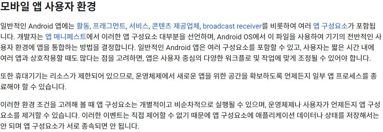 또한 "이러한 이벤트는 직접 제어할 수 없기 때문에 앱 구성요소에 애플리케이션 데이터나 상태를 저장해서는 안 되며 앱 구성요소가 서로 종속되면 안 된다."