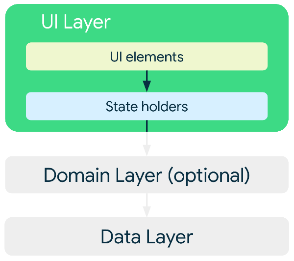 UI 레이어는 화면에 애플리케이션 데이터를 표시해준다. 사용자 상호작용(예: 버튼 누르기) 또는 외부 입력(예: 네트워크 응답)으로 인해 데이터가 변할 때마다 변경사항을 반영하도록 UI가 업데이트되어야 한다.
